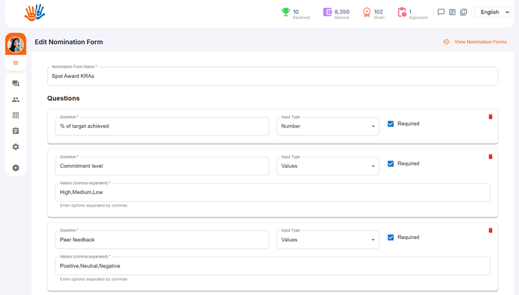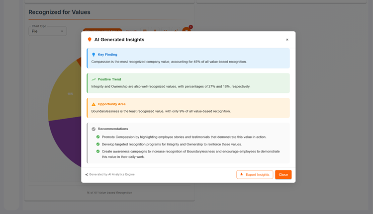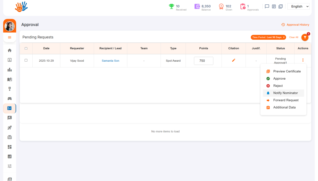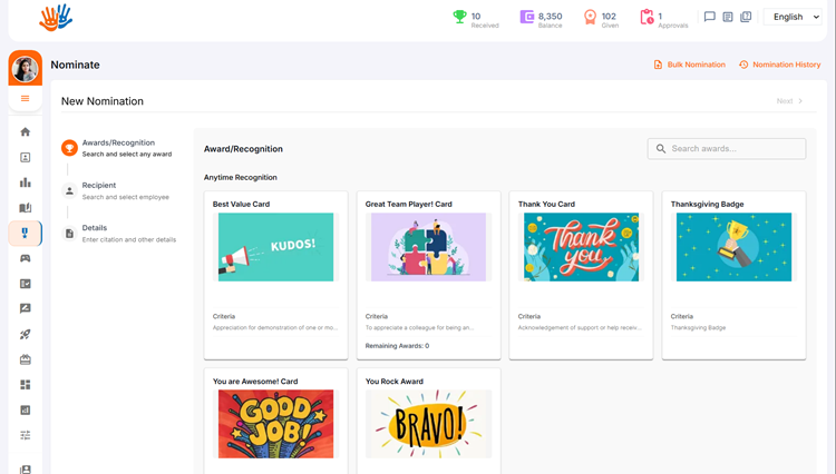 The platform enables supervisors and co-workers to nominate, recognize, and reward employees using a points-based system for performance, demonstrating core values, learning and development, innovation, and other criteria. It also enables approvals and budgeting.