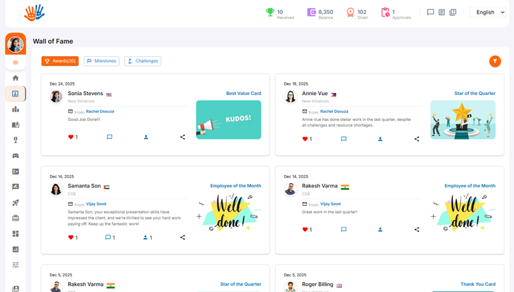 HiFives has social features such as a wall of fame and gamification features such as leaderboards, e-certificates, and digital badges. It also has a global redemption system with country-specific e-gift card options in 25+ countries worldwide. HiFives also incorporates many best practices of employee rewards and recognition.